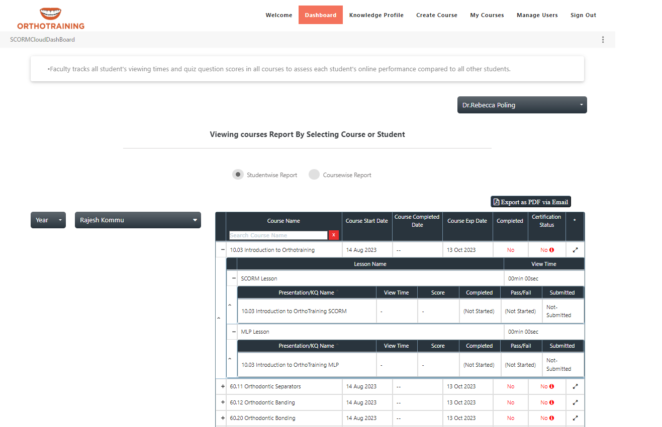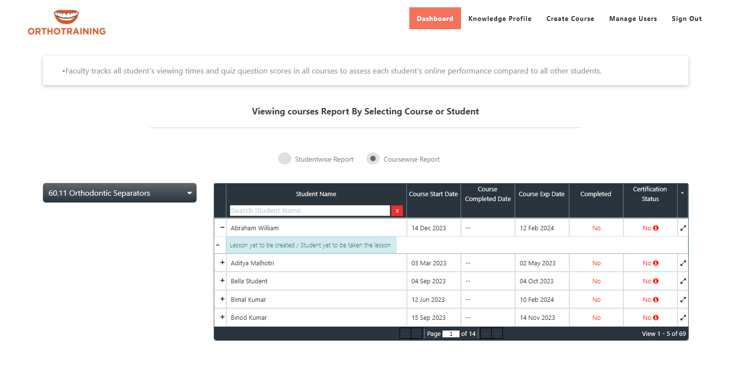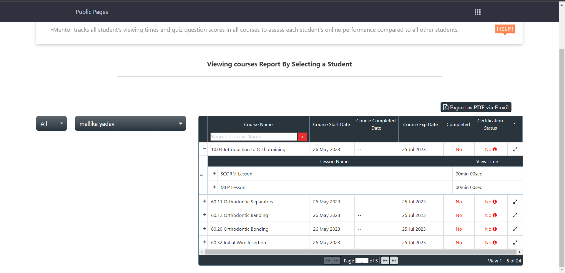 - Select either course or student, then can view the performance like how many courses are mapped, how many courses they have completed, how much time spent, when they completed the course and the status of the certificate.