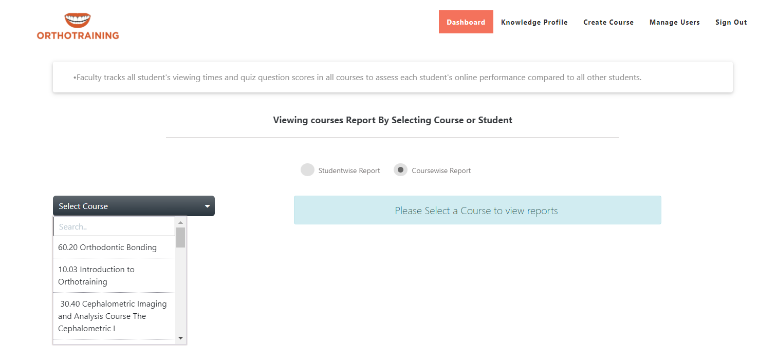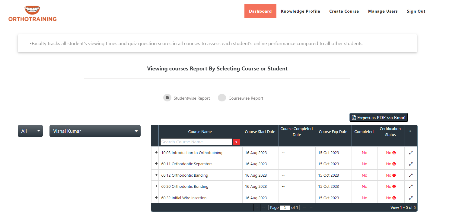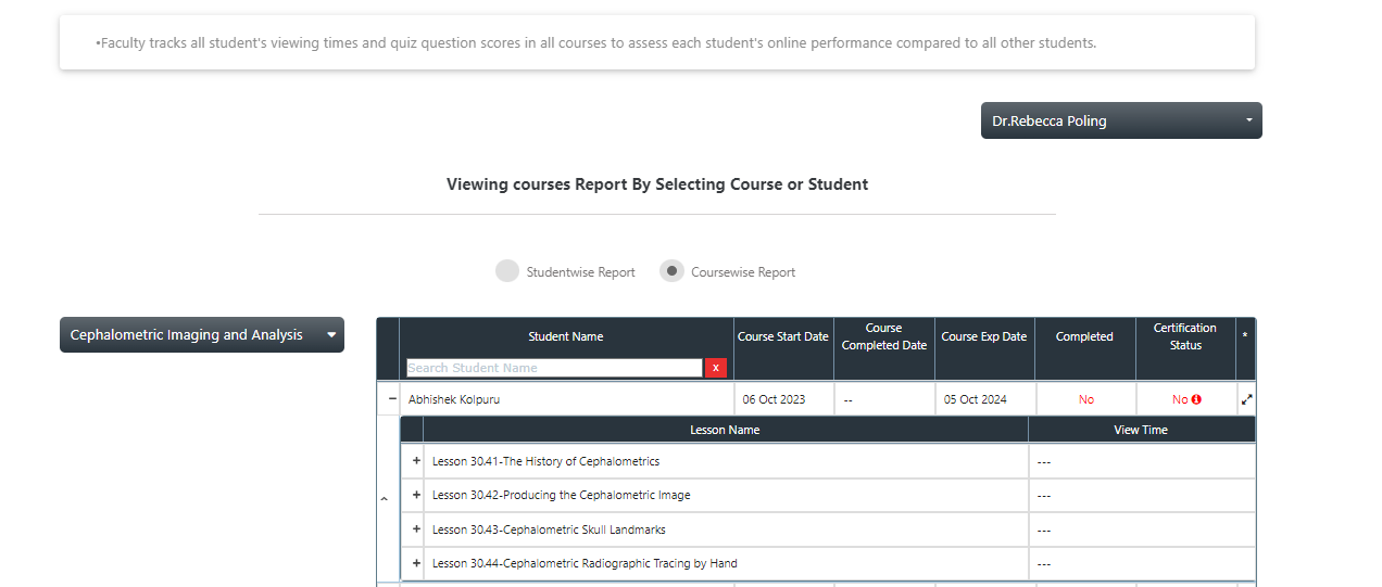 - Select either course or student, then can view the performance like how many courses are mapped, how many courses they have completed, how much time spent, when they completed the course and the status of the certificate.