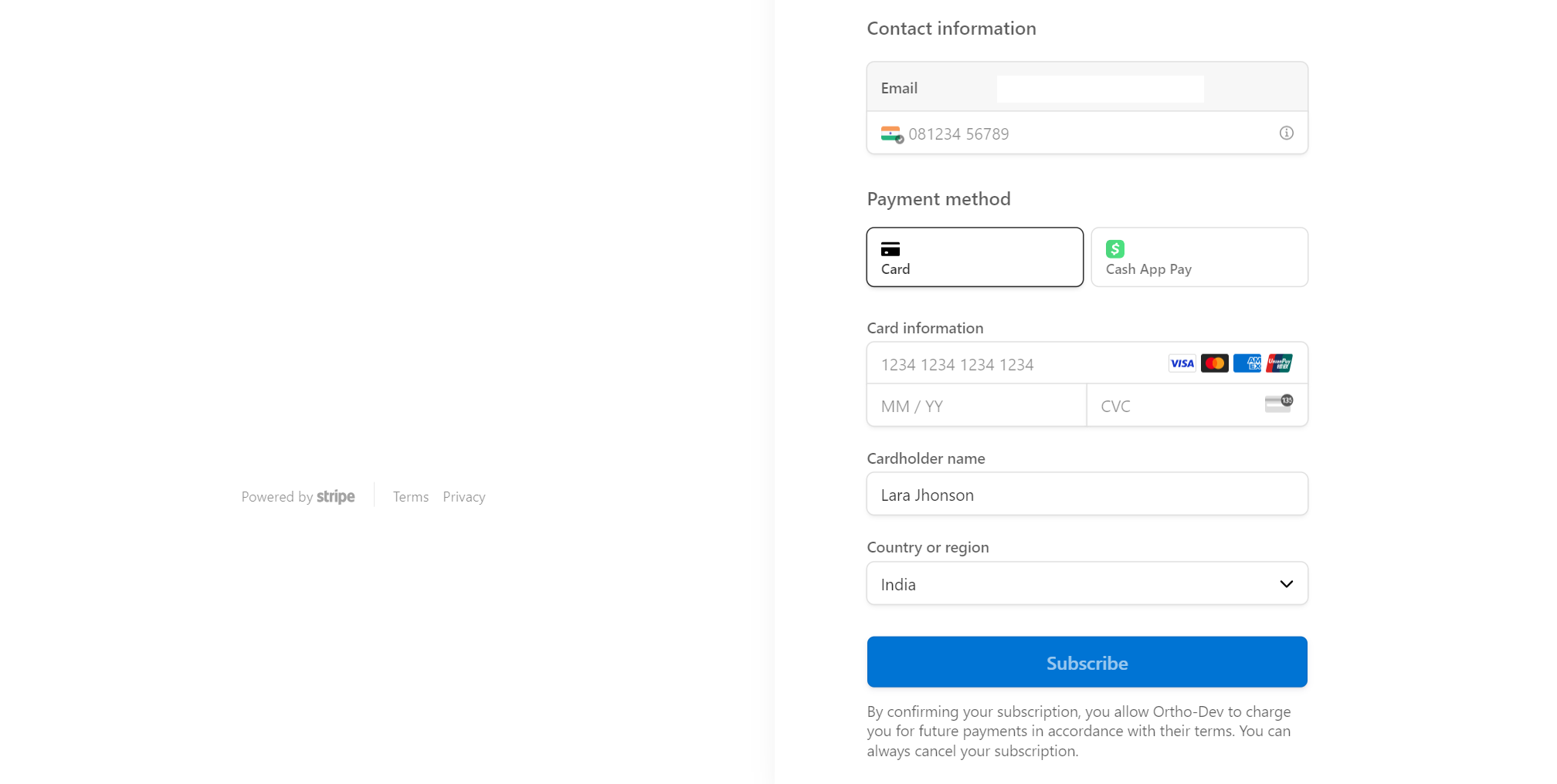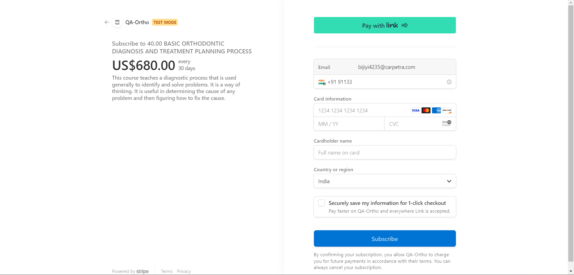 - Enter your card details and click on the "Subscribe" button to confirm your enrollment.