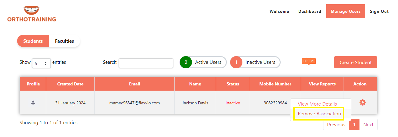 - Upon removing the association, the details of that specific user will not appear on the Manage User page. Note: Association can only be removed if there is no subscription between the two users.