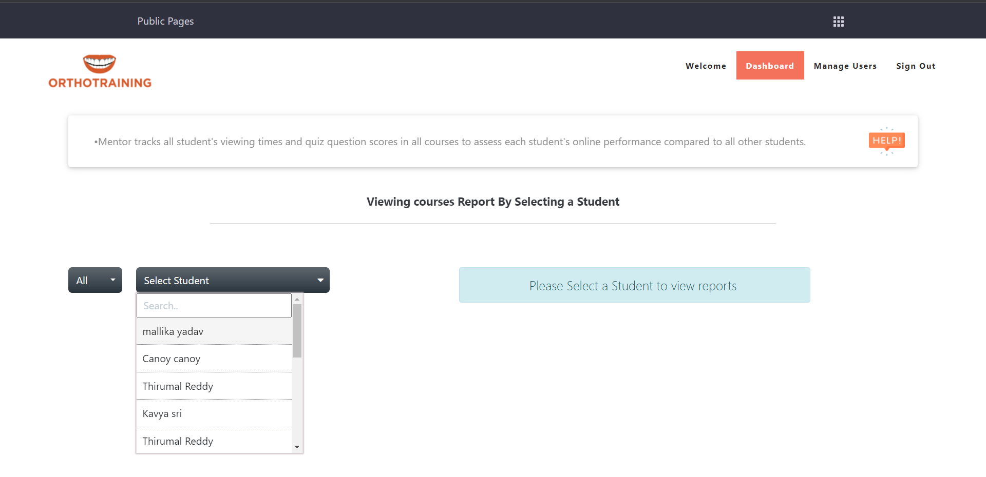 - On the Dashboard page, choose the student from the dropdown menu to view their specific course report.