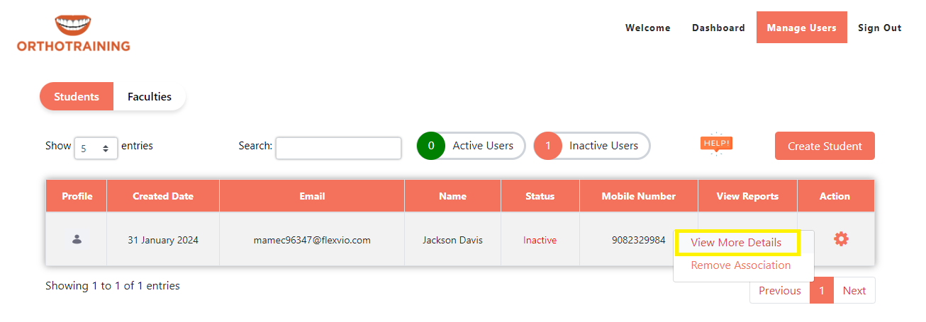 - For each user in the Action column, you will find two options: "View More Details" and "Remove Association."