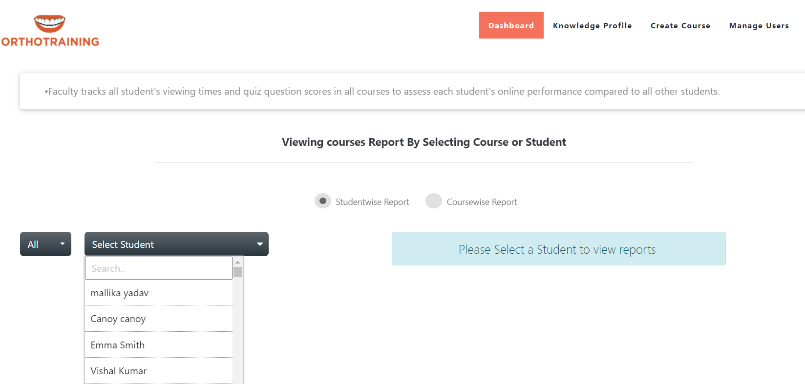 - Select either course or student, then can view the performance like how many courses are mapped, how many courses they have completed, how much time spent, when they completed the course and the status of the certificate.
